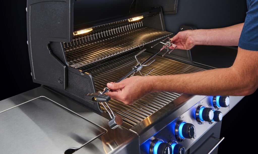 Le brûleur arrière de rôtisserie, lui aussi connecté et réglable depuis l’application îQue, complète les équipements avec son kit rôtisserie complet comprenant la broche, les fourches et le moteur Premium. La cuisson à la broche d’une ou plusieurs pièces de viande jusqu’à 7kilos, n’a jamais été aussi simple.